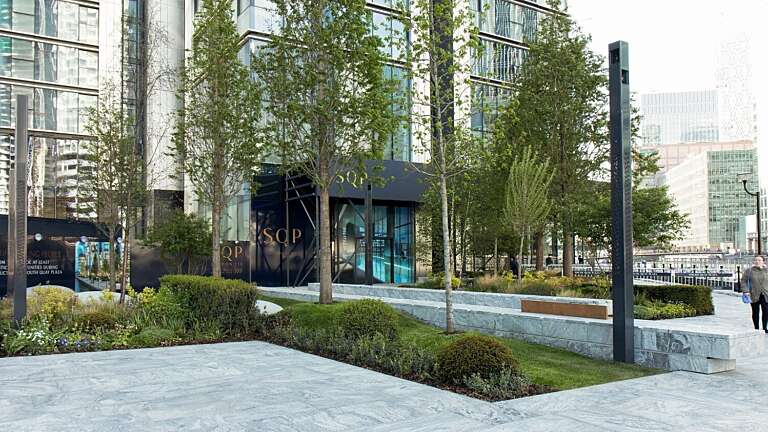 South Quay Plaza is a landmark development designed by architects Foster + Partners. The buildings have been designed to make the best use of the space that surrounds them and there is, mixed within the scheme, 2.6 acres of gardens. Sunlight is able to light up these gardens throughout the day and many of the apartments have dual aspect views. The client wanted lots of variation and banding within the stone for the landscape areas and finally settled on one of our very interesting and original granite options called Running River from Northern China.