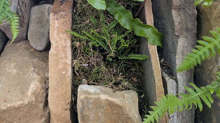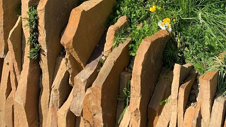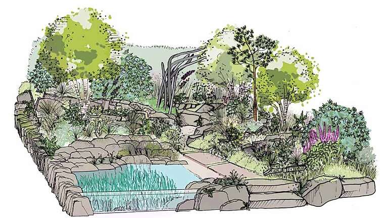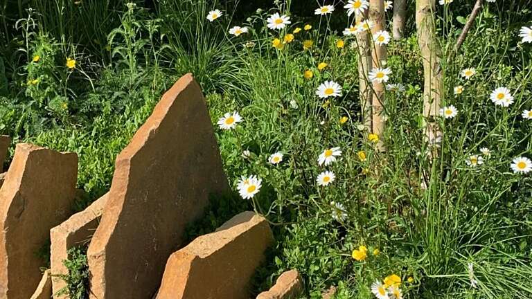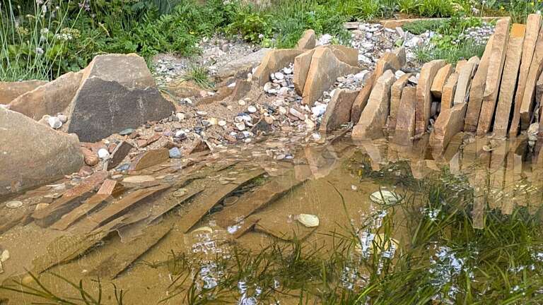 The garden captures a distinctly coastal atmosphere. Slabby Sandstone supplied by CED Stone forms rock outcrops emerging from a saltwater pool and pebble beach, creating planting zones that range from boggy hollows to slightly freer-draining elevated areas. Earlier in the year, CED’s Terry Saxton helped Ryan hand-select the stone at the quarry, and contractors Frogheath Landscaping have used it throughout the build.