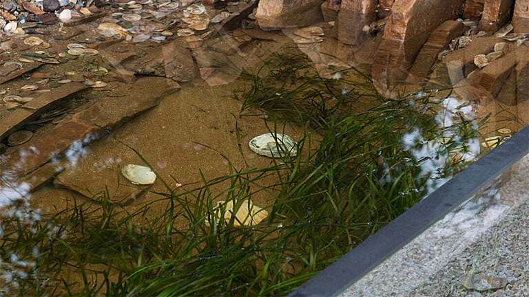 A sandstone step-stone path leads to an informal rocky seating area, where a flowing seagrass sculpture links the land garden with the saltwater pool planted with real seagrass. At the front, a viewing window set into the rocky outcrops offers a glimpse into Loch Craignish’s underwater world.