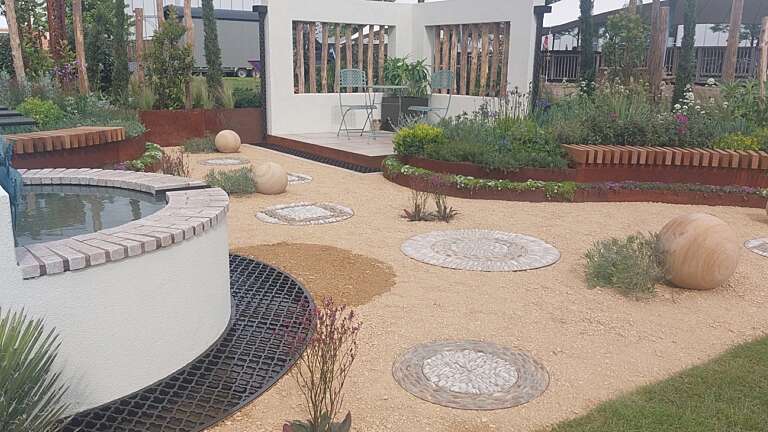 Water features and pebble mosaic stepping stones reflect the area’s Moorish heritage, guiding visitors through the garden to a shaded corner patio offering relief from the sun. CED Stone supplied Flat Beige Pebbles for the beautiful mosaics which feature in the garden.