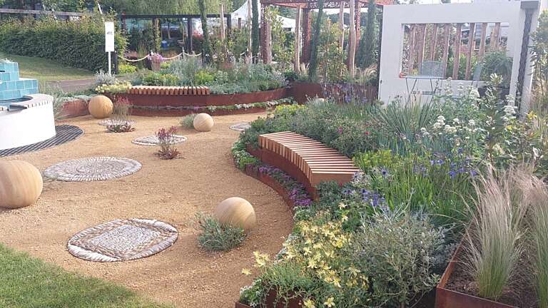 The Costa Cadiz garden captures the essence of Spain’s Atlantic coastline in a compact, transferable design, evoking the relaxed ‘good life’ of warmer climates. Corten steel planters reference the region’s red cliffs, while sandstone spheres echo the scattered coastal rocks. Integrated timber benches sit within the planters, underplanted with flowing ribbons of Armeria maritima and Thymus.
