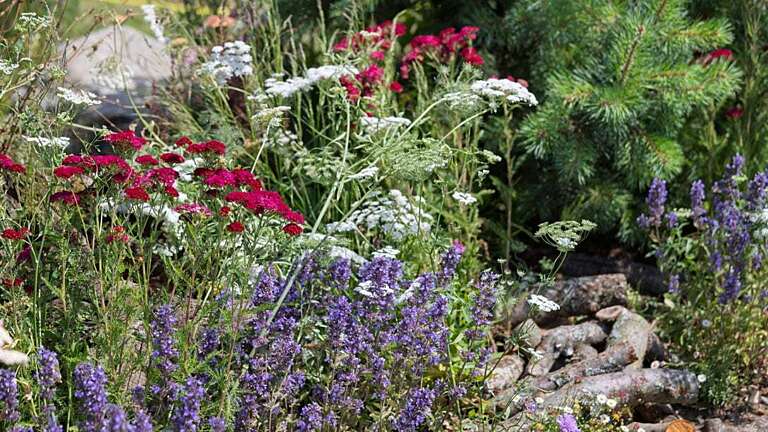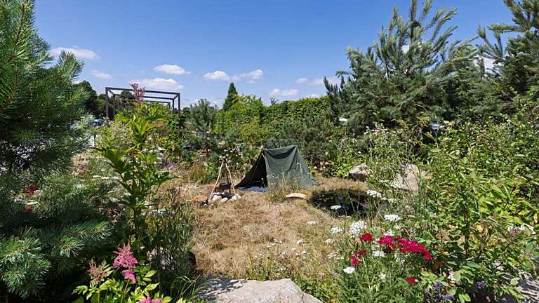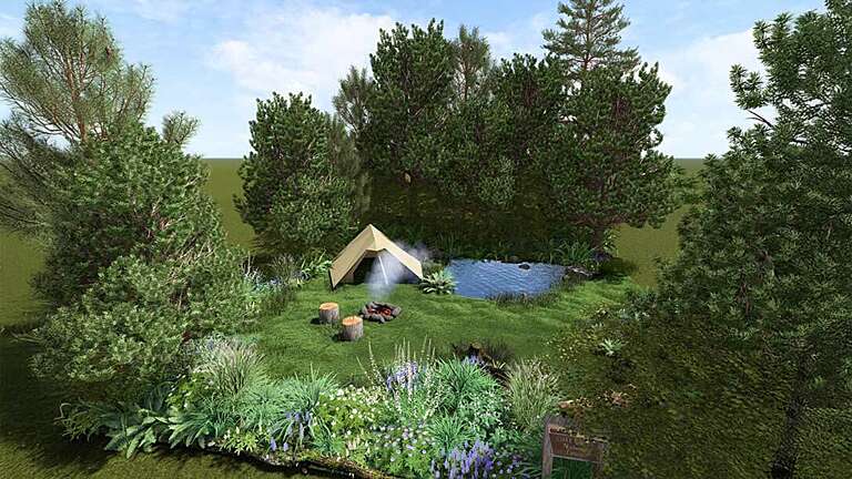 Inspired by Oregon’s diverse natural landscapes and its commitment to regenerative tourism, the garden celebrates the state’s rugged outdoor beauty. A natural camping scene forms the focal point, with a canvas tent and fire pit set within forest-inspired, pollinator-friendly planting and water features.