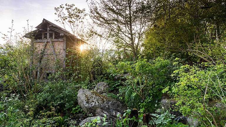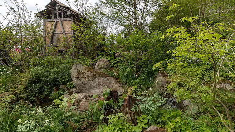 Native planting includes the endangered Filipendula formosa Nakai, whose pink flowers provide a focal point, alongside trees, herbs and edibles valued for their healing properties.