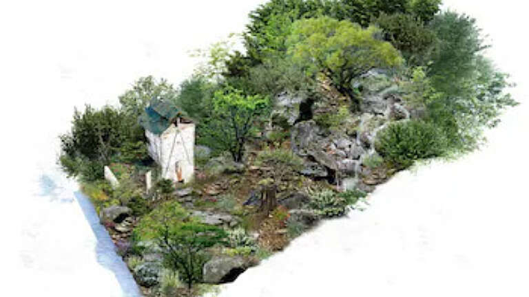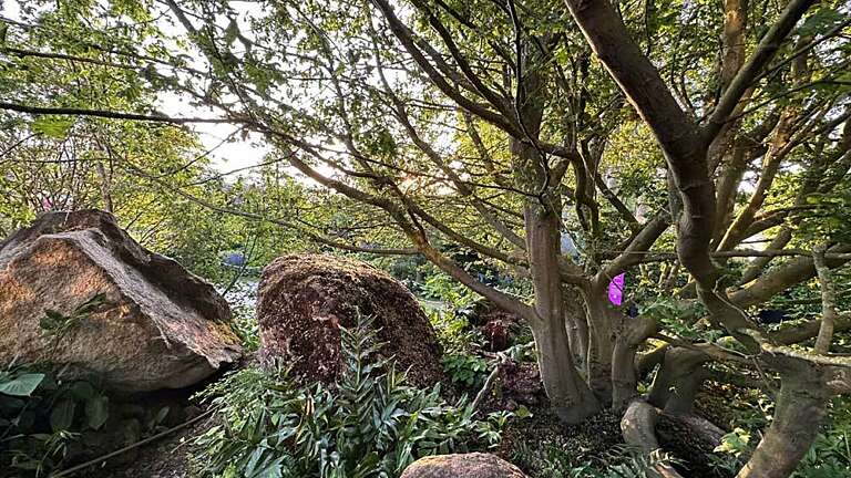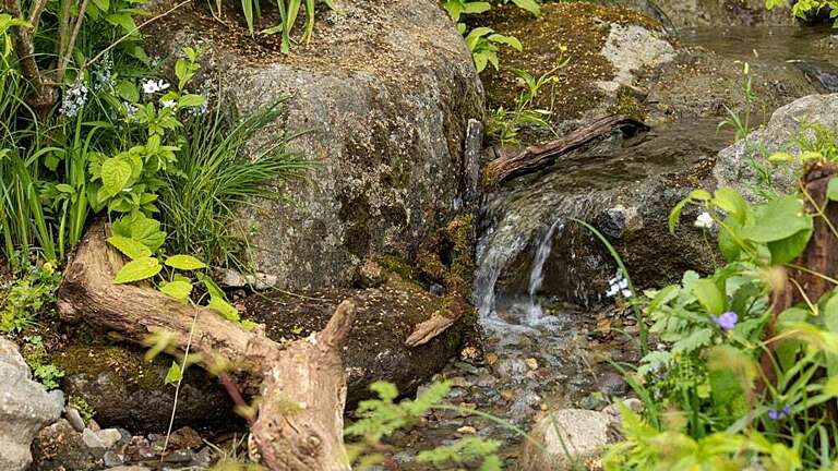 Layered rocks supplied by CED Stone recreate the mountain landscape, forming streams and creating a protective, moisture-rich environment for plants. These stones shelter delicate species and help maintain humidity during dry periods.