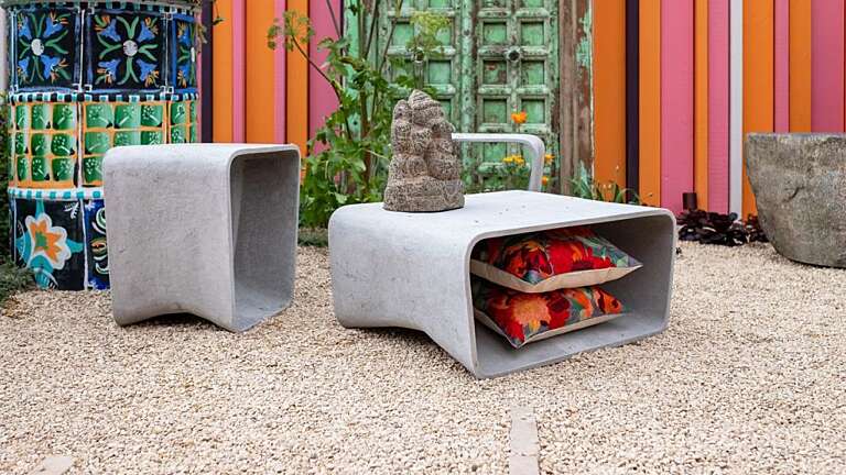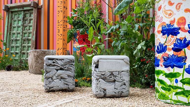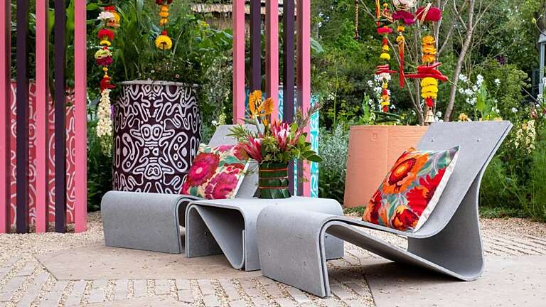 Inspired by Manoj’s Indian heritage, the garden features a vibrant orange and pink palette reflecting the bold colours of Indian saris. Marigolds used in Hindu worship sit alongside spices and traditional oil lamps (diya), evoking festival and ceremonial traditions. Manoj’s background in fashion is expressed through richly embellished scatter cushions and Kuba cloth, also referencing his African roots.