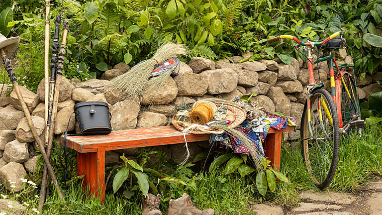 Key features include a shaded medicinal garden beneath eucalyptus and banana trees, a local craft kiosk, a lifelike gorilla nest set among bamboo and food plants, and a dramatic waterfall with a viewing rock surrounded by high-altitude planting. CED Stone supplied Highland Cobbles for the drystone walling, as well as the large boulders used to form the waterfall.