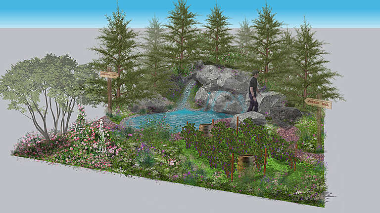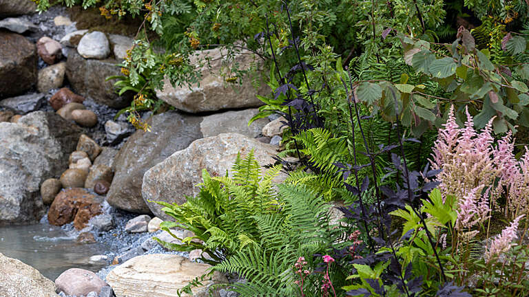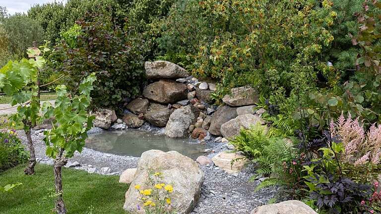 Dramatic boulders supplied by CED Stone form a rugged backdrop, complemented by bark-chip woodland paths, a naturalistic water feature using a variety of natural stone rockery from CED, and gnarled grapevines inspired by Oregon’s wine regions.