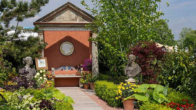 The design reflects The Laskett Garden in spring, incorporating authentic elements from the original garden, from its architectural features to abundant spring primulas.