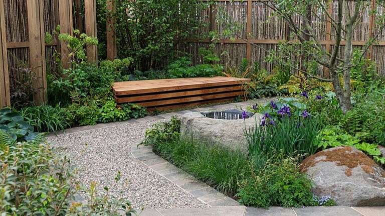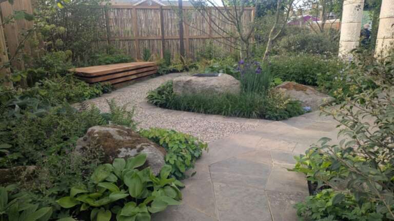 The Pathway Garden is built entirely from upcycled materials. The bench is carved from a fallen tree trunk, while a mycelium wall, created using recycled waste from previous RHS Shows, reflects the natural networks below the ground. This symbolism echoes how individuals supported back into stable housing often go on to help others, strengthening communities and fostering lasting positive change.