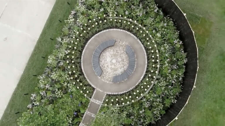 The garden features a striking circular sculpture of 100 golden tractors and the planting mixes meadow and monoculture planting styles. A charred oak backdrop and circular seating suggest farm buildings dotted across the pastoral landscape. The garden reflects the atmosphere of walking through the countryside, where nature looks on as tractors cultivate the fields.