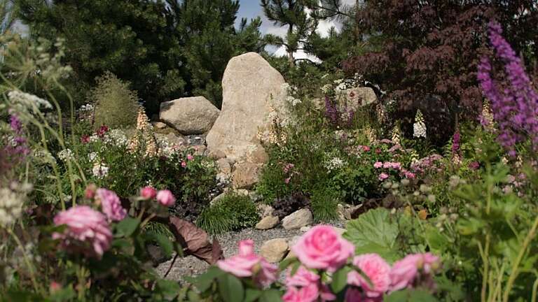 These boulders and rockery have been selected for their rustic look, slightly somber with atmospheric shades of mid to dark greys and browns, they will look like they have been in situ forever. Water will cascade down the rocky outcrop into a natural pool at the bottom. The planting colour palette consists of deep reds, creams and pinks, with plants chosen for their insect attracting qualities and gnarled grape vines representing the wine-growing regions of Oregon.